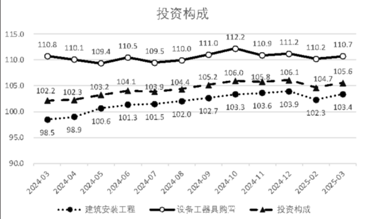 2025年3月,投资构成指数为105.6,较前值回升0.9(图4)。其中,设备工器具购置指数为110.7,比前值上升0.5。在大规模设备更新政策“加力扩围”推动下,电子信息、安全生产、设施农业等领域设备工器具购置投资明显增加。作为新经济重要产品代表的工业机器人产量增长26%,反映制造业向高端化、自动化转型稳步推进。建筑安装工程指数为103.4,比前值回升1.1,其中,水泥产量增速降幅收窄4.3个百分点,钢材产量增速加快1.4个百分点,挖掘机产量增长14.6%。