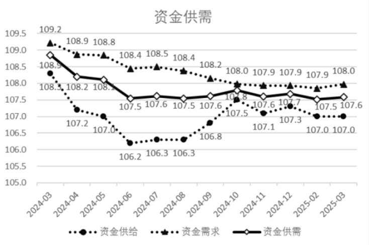 2025年3月,资金供需指数为107.6,比前值小幅上升0.1(图6)。资金需求方面,社会融资规模存量同比上升8.4%,增速较前值加快0.2个百分点。在资金需求结构上,金融机构中长期贷款余额同比上升7%,与前值持平,显著低于往年同期水平,反映经营主体中长期融资需求仍然不足,民营企业“融资难”“融资贵”等问题仍需进一步解决。