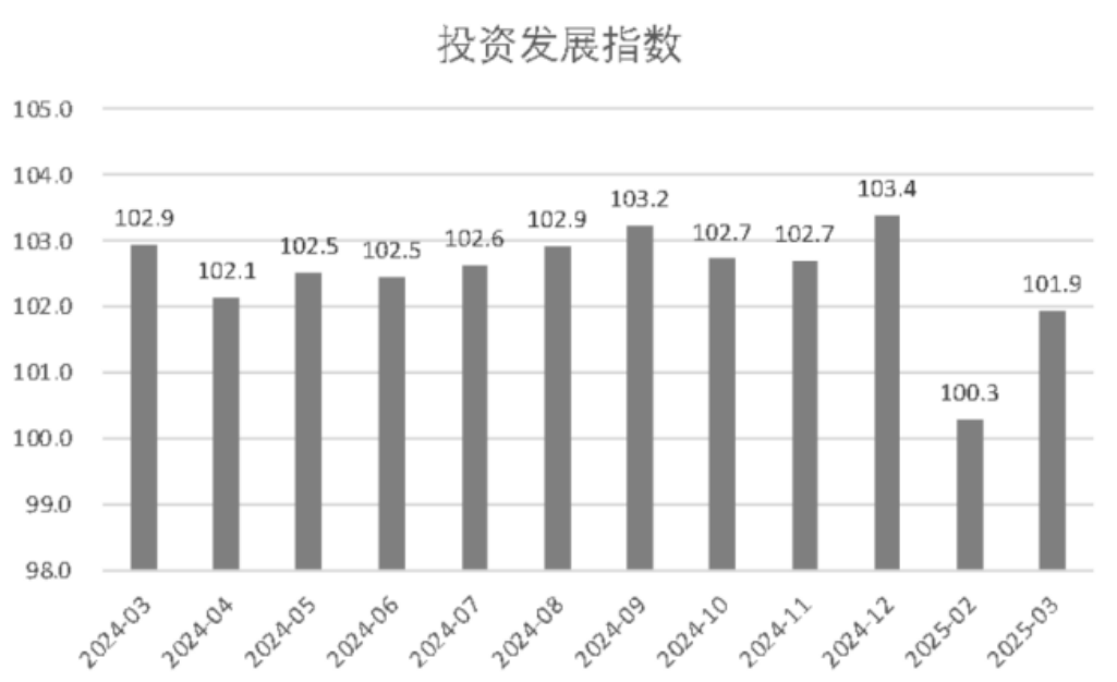 2025年3月,投资发展指数回升至101.9,较前值上升1.6(图1)。从数据看,一季度固定资产投资开局良好,投资规模、投资构成、投资意愿、资金供需、宏观经济热度等分项指数均有回升,稳投资积极因素持续累积。