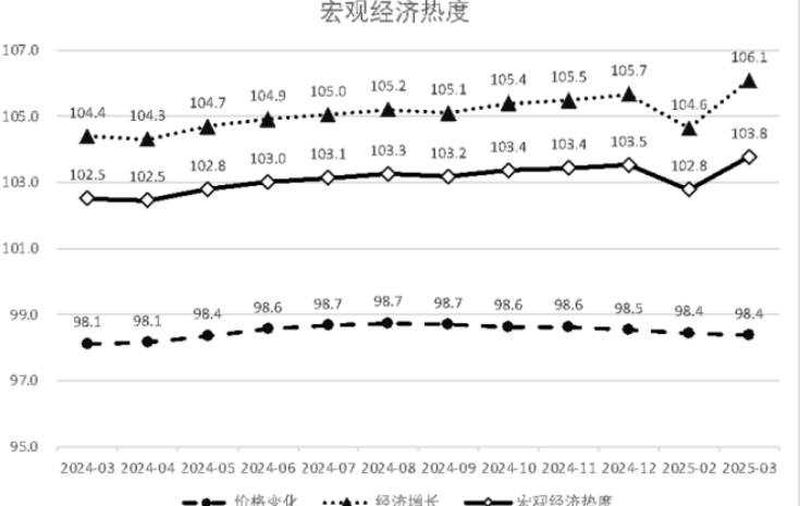 2025年3月,宏观经济热度指数为103.8,比前值回升1.0(图7)。其中,经济增长指数为106.1,比前值上升1.5。在美国政府关税措施压力下,出口清库存速度加快,1-3月份以美元计价累计出口总额同比增长5.8%。一季度,GDP增速达到5.4%,超出预期,实现良好开局,其中,规上工业增加值累计增长6.5%,比上年同期提高0.4个百分点;服务业增加值同比增长5.3%,比上年全年加快0.3个百分点;价格指数下行压力仍然较大,3月,CPI同比下降0.1%,PPI同比下降2.3%,反映内需不足问题仍然存在。