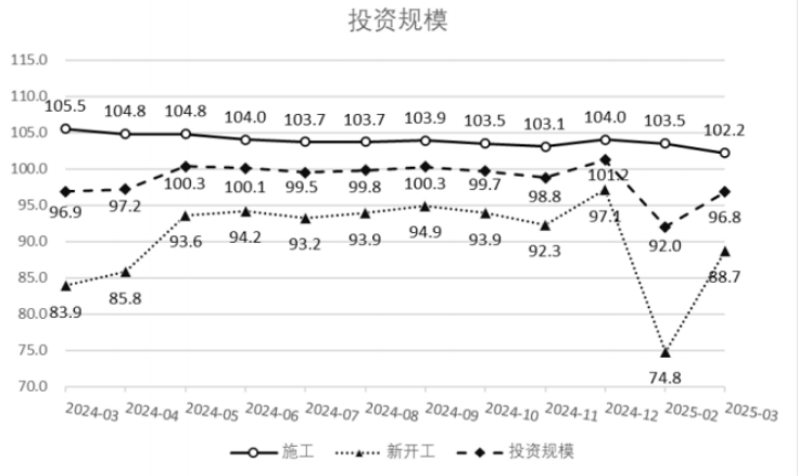 2025年3月,投资规模指数为96.8,较前值上升4.8(图3)。其中,施工项目指数为102.2,比前值下降1.3;新开工项目指数为88.7,比前值回升13.9。超长期特别国债资金、中央预算内投资等资金加速拨付到位,地方政府专项债券发行使用进度加快,推动项目新开工和施工速度加快,拉动投资规模回升。