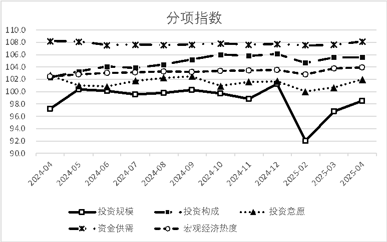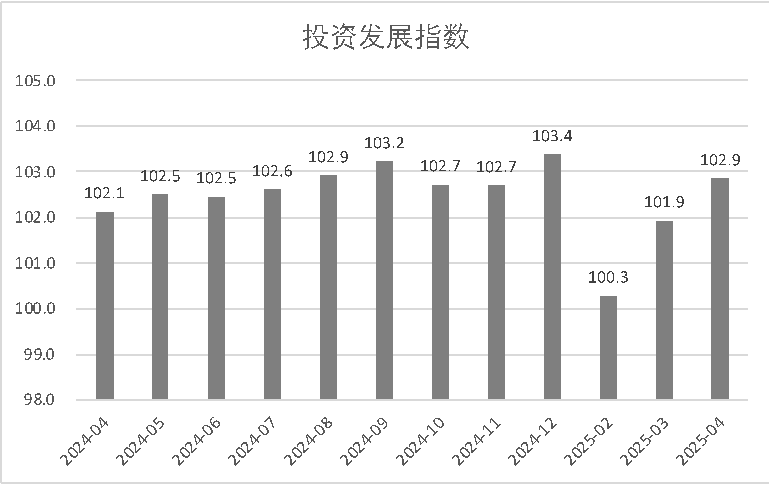 2025年4月,投资发展指数为102.9,比前值提高1.0(图1)。随着投资结构持续优化、投资规模稳定增长,投资发展指数延续3月以来的上升态势。其中,投资规模、投资意愿、资金供需、宏观经济热度等分项指数均持续回升,投资增长基础实、空间大。