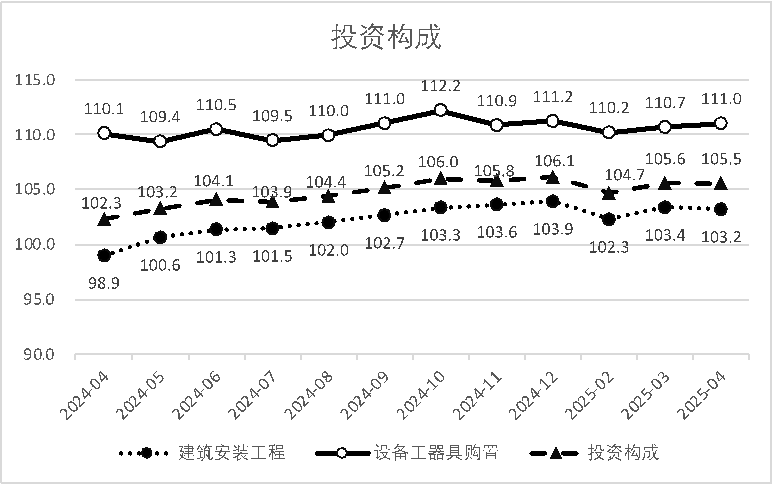 2025年4月,投资构成指数为105.5,比前值小幅下降0.1(图4)。其中,设备工器具购置指数为111.0,比前值上升0.3。“两新”政策扩围提质效果持续显现,1—4月,设备工器具购置投资同比增长18.2%,对全部投资增长的贡献率为64.5%,拉动全部投资增长2.6个百分点。