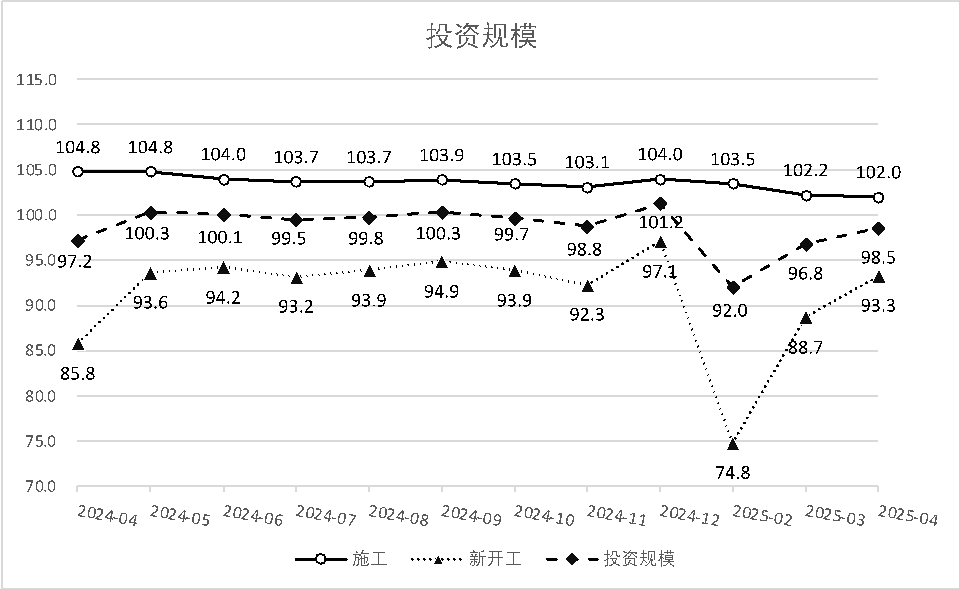2025年4月,投资规模指数为98.5,较前值上升1.7(图3)。其中,施工项目指数为102.0,比前值小幅下降0.2;新开工项目指数为93.3,比前值大幅回升4.6。优化完善地方政府专项债券管理机制和政策举措,提高了专项债券的发行使用效率,激发了地方谋划项目积极性,推动新开工项目指数快速回升。