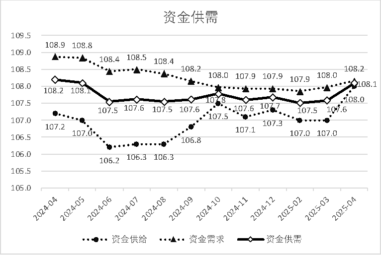 2025年4月,资金供需指数为108.1,比前值上升0.5(图6)。社会融资规模存量同比上升8.7%,增速较前值加快0.3个百分点,社会融资总体需求有所上升。金融机构中长期贷款余额同比增长6.9%,增速较前值下降0.1个百分点,低于上年同期3.3个百分点,经营主体中长期融资需求仍有较大提振空间。
