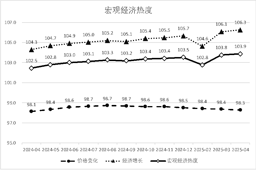 2025年4月,宏观经济热度指数为103.9,比前值提高0.1(图7)。其中,经济增长指数为106.3,比前值上升0.2。出口展现较强韧性,1—4月出口累计增长6.4%,比1-3月提高0.6个百分点。其中,对美出口受高额关税影响,4月下降20.2%,拉低整体出口2.9个百分点。工业和服务业生产增势平稳,内需稳步扩大。1—4月,规上工业增加值累计增长6.4%,比上年同期高0.1个百分点;服务业生产者指数累计增长5.9%,比1-3月加快0.1个百分点。4月,价格变化指数为98.3,比前值下降0.1,通缩压力仍然较大。其中,1—4月,CPI累计同比下降0.1%,与前值持平;PPI累计同比下降2.4%,降幅比1-3月扩大0.1个百分点。