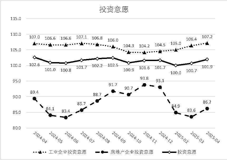 2025年4月,投资意愿指数为101.9,比前值上升1.2(图5)。其中,工业企业投资意愿指数为107.2,比前值提高0.8。工业企业利润面持续修复,1—3月,规模以上工业企业利润总额累计增长0.8%,自2024年10月以来首次转正,工业企业应收账款同比增长9.9%。4月,房地产企业投资意愿指数回升至86.2,比前值提高2.6。1—4月,百城土地成交面积累计同比下降9.5%,降幅比1-3月收窄4.5个百分点。房地产新开工面积累计下降23.8%,降幅比上月收窄0.6个百分点。