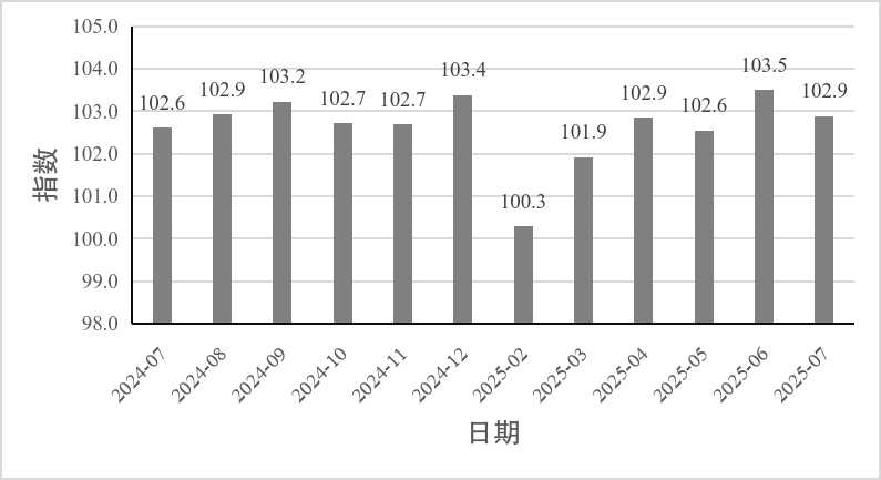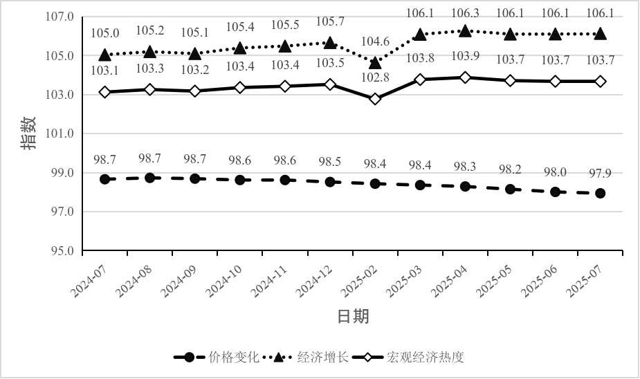 2025年7月,宏观经济热度指数为103.7,连续3个月持平(见图7)。其中,经济增长指数为106.1,与前值相同。出口表现强劲,1—7月累计增长6.1%(以美元计价),比1—6月提高0.2个百分点,实现逆势回升。工业和服务业生产保持平稳,1—7月,规模以上工业增加值累计增长6.3%,比1—6月低0.1个百分点;服务业生产者指数累计增长5.9%,与1—6月持平。价格变化指数为97.9,比前值下降0.1。1—7月,全国居民消费价格比上年同期下降0.1%,与1—6月持平;工业生产者出厂价格比上年同期下降2.9%,降幅比1—6月扩大0.1个百分点。