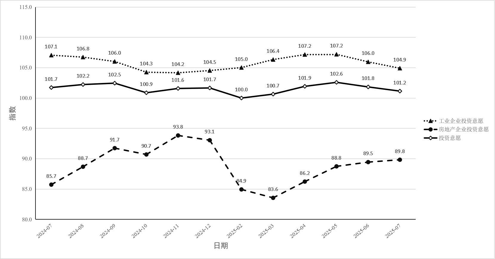 2025年7月,投资意愿指数为101.2,比前值低0.6(见图5)。其中,工业企业投资意愿指数为104.9,较前值下降1.1。受行业竞争加剧、内需不足等因素影响,1—6月,规模以上工业企业利润总额累计下降1.8%,降幅比1—5月扩大0.7个百分点。在清欠行动助力下,工业企业应收账款累计增速降至7.8%,比1—5月下降1.2个百分点,实现连续3个月下降。7月,房地产企业投资意愿指数为89.8,比前值提高0.3,连续4个月提高。1—7月,百城土地成交面积累计下降6.2%,降幅比1—6月收窄0.3个百分点;房地产新开工面积累计下降19.4%,降幅比1—6月收窄0.6个百分点。