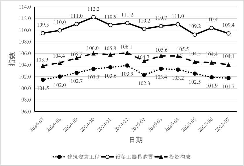 2025年7月,投资构成指数为104.1,比前值下降0.3(见图4)。其中,设备工器具购置指数为109.4,虽较前值下降1.0,仍处于相对较高水平;建筑安装工程指数为101.7,比前值下降0.2。在“两新”政策激励下,1—7月,设备工器具购置投资同比增长15.2%,增速比全部投资高13.6个百分点,拉动全部投资增长2.2个百分点。1—7月,工业机器人产量累计增长32.9%,制造业投资继续向高端化、智能化转型;受房地产市场下行影响,水泥等重要建筑原材料产量继续下降,1—7月,水泥、平板玻璃产量分别下降4.5%、5.0%。