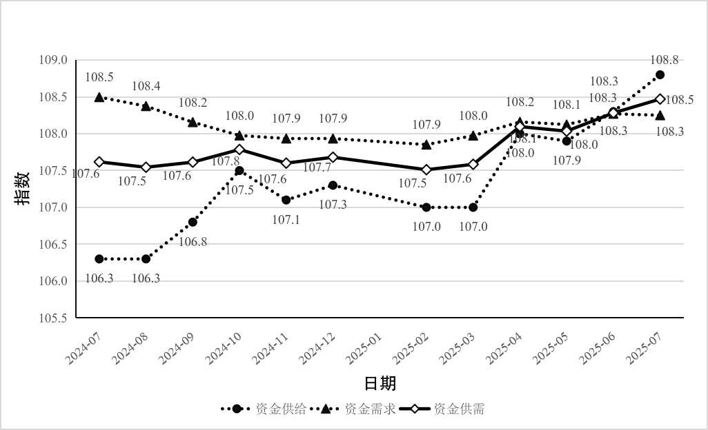 2025年7月,资金供需指数为108.5,比前值提升0.2,适度宽松货币政策持续显效,为市场注入较强流动性(见图6)。其中,资金供给指数为108.8,比前值提高0.5。1—7月,M2同比增速为8.8%,比1—6月加快0.5个百分点,市场流动性较为宽松。7月,社会融资规模存量同比上升9.0%,比上月提高0.1个百分点,社会融资需求持续回升。7月,金融机构中长期贷款余额同比增长6.5%,比6月低0.3个百分点,中长期融资需求持续下降,反映经营主体长期投资信心不足。