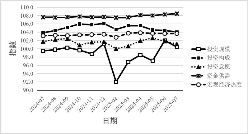 2025年7月,投资发展指数为102.9,比上月回落0.6(见图1)。从分项指数看,今年“两重”项目清单提前下达完毕,地方政府专项债券加快发行使用,对项目新开工和施工计划投资规模形成有力支撑,投资规模指数保持在增长区间;设备工器具投资增长较快,投资构成指数保持高位运行;适度宽松货币政策持续发力,资金供需指数进一步上升;工业企业利润降幅有所扩大,投资意愿指数小幅回落;出口在外部冲击下逆势上升,物价指数降幅继续扩大,宏观经济热度指数保持平稳(见图2)。