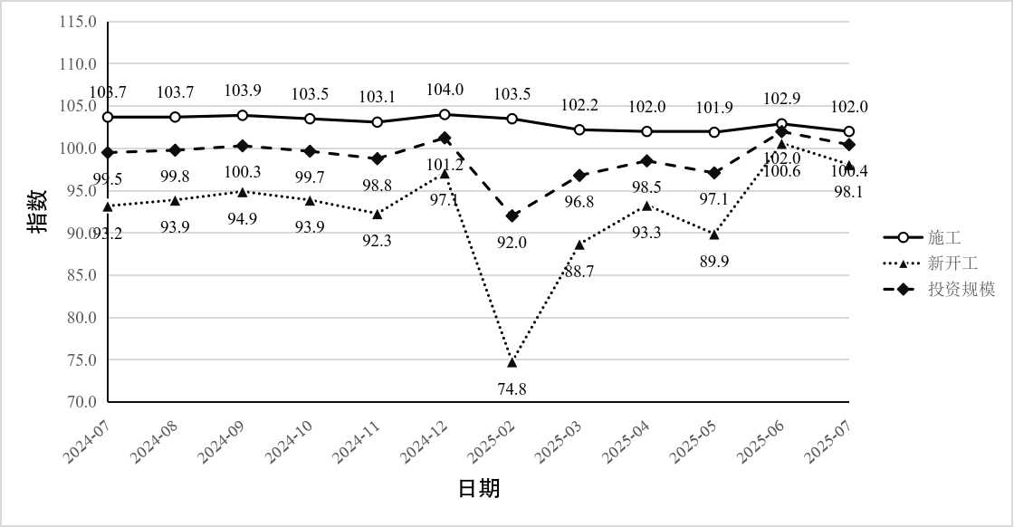 2025年7月,投资规模指数为100.4,尽管较前值回落1.6,但仍显著高于2025年6月之前各月的投资规模指数值(见图3)。地方政府专项债券和超长期特别国债发行使用加快,为投资规模稳定增长提供了坚实支撑。其中,1—7月,施工项目计划总投资累计增长2.0%,比1—6月下降0.9个百分点。新开工项目计划总投资增速为-1.9%,比1—6月低2.5个百分点,但仍为2023年5月以来的第二高点,其中重大项目投资发挥重要支撑作用。