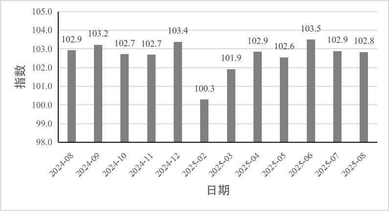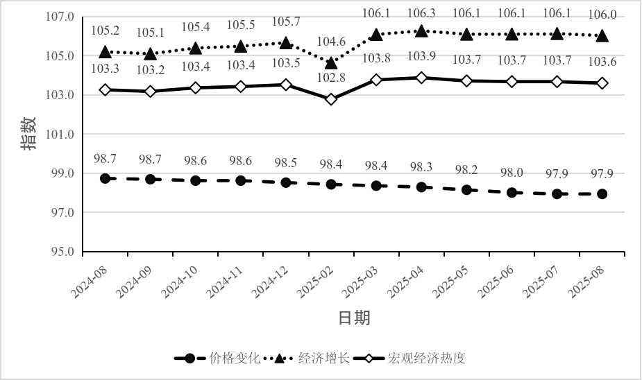 2025年8月,宏观经济热度指数为103.6,比前值下降0.1,总体保持稳定(见图7)。其中,经济增长指数为106.0,比前值下降0.1。出口表现出较强韧性,1—8月累计增长5.9%(以美元计价)。工业和服务业生产保持平稳,1—8月,规上工业增加值累计增长6.2%,服务业生产者指数累计增长5.9%。8月,价格变化指数为97.9,与前值持平,各项价格指数仍处于负增长区间。1—8月,全国居民消费价格比上年同期下降0.1%,与1—7月持平,工业生产者出厂价格比上年同期下降2.9%,与1—7月持平。