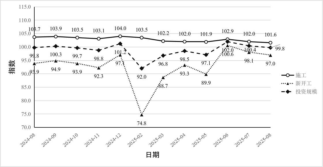 2025年8月,投资规模指数为99.8,较前值回落0.6(见图3)。1—8月,施工项目计划总投资累计增长1.6%,比1—7月下降0.4个百分点。新开工项目计划总投资增速为-3.0%,降幅比1—7月扩大1.1个百分点。施工项目和新开工项目计划总投资增速均连续两个月下降,不利于形成实物工作量。