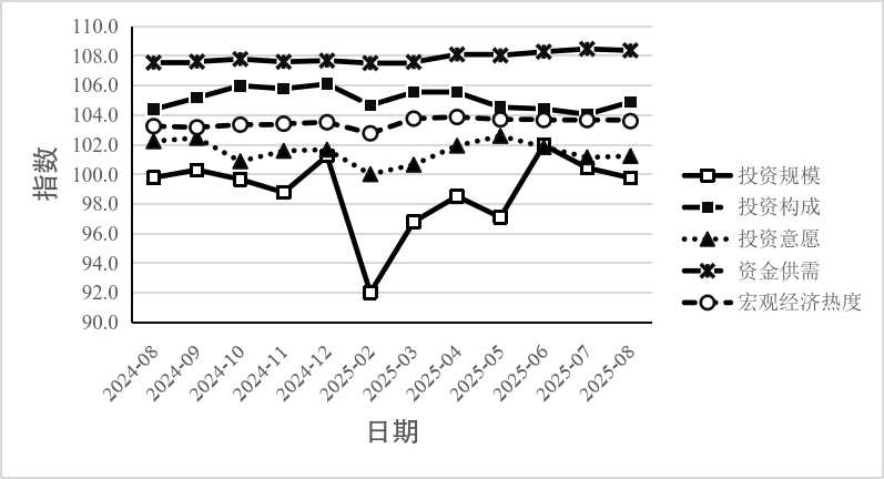 2025年8月,投资发展指数为102.8,比上月小幅下降0.1,降幅明显收窄(见图1)。从分项指数看,投资规模指数降至负增长区间;设备工器具购置投资增速较快,投资构成指数明显上升,对拉动投资发展指数的贡献较大;房地产企业投资意愿略有好转,投资意愿指数与上月大致相当;适度宽松货币政策持续显效,资金供需指数保持高位;货物进出口持续增长,出口保持较强韧性,工业生产、服务业较快增长,其中,装备制造业快速增长,铁路船舶航空航天行业增加值增速为12.0%,汽车、电气机械行业也分别增长8.4%和9.8%。宏观经济热度指数保持平稳(见图2)。