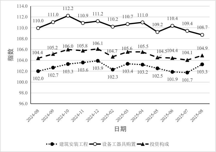 2025年8月,投资构成指数为104.9,比前值上升0.8,是5个分项指数中唯一实现正增长的指数(见图4)。其中,设备工器具购置指数为108.7,保持在较高水平。大规模设备更新政策效应持续释放,1—8月,设备工器具购置投资累计增长14.4%,增速比全部投资高13.9个百分点,拉动全部投资增长2.1个百分点。1—8月,工业机器人产量累计增长29.9%,制造业智能化、自动化转型加速推进。8月,建筑安装工程指数为103.3,比前值上升1.6。1—8月,挖掘机、钢材等与建筑安装工程密切相关的建材、设备产量明显上升,其中,挖掘机产量累计增长17.6%,比1—7月提高6.5个百分点,钢材产量累计增长5.5%,比1—7月提高0.4个百分点。