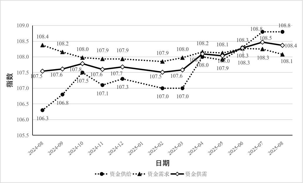 2025年8月,资金供需指数为108.4,比前值微降0.1(见图6)。其中,资金供给指数为108.8,与前值持平。M2同比增长8.8%,保持较高增速,反映在适度宽松货币政策支持下,市场流动性整体较为宽松。资金需求指数为108.1,比前值下降0.2。8月,社会融资规模存量同比上升8.8%,增速比7月下降0.2个百分点。金融机构中长期贷款余额同比增长6.4%,比7月下降0.1个百分点,中长期融资需求仍需提振。