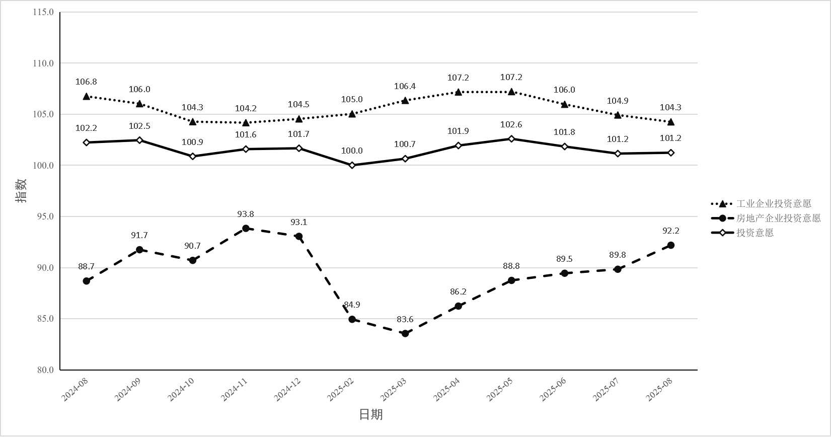 2025年8月,投资意愿指数为101.2,与前值持平(见图5)。其中,工业企业投资意愿指数为104.3,较前值下降0.6。随着清欠行动的深入开展,工业企业应收账款累计增速明显下降,1—7月,工业企业应收账款累计增长6.8%,比前值下降1个百分点,连续4个月下降。工业企业利润总额累计增速仍处于负增长区间,1—7月同比下降1.7%,在一定程度上抑制了企业扩大再生产的意愿。8月,房地产企业投资意愿指数为92.2,比前值提高2.4,连续5个月回升。1—8月,百城土地成交面积累计下降2.8%,降幅比1—7月收窄3.4个百分点;房地产新开工面积累计下降19.5%,降幅比1—7月扩大0.1个百分点。