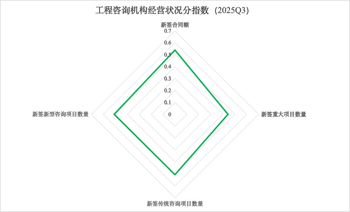 2025年三季度工程咨询机构经营状况分指数为49.4%,较二季度下降1.8个百分点,回落至收缩区间。其中,新签合同额评价指标指数为53.8%,新签新型咨询项目评价指标指数为50.8%,新签传统咨询项目评价指标指数为50.5%。受项目审批流程延长、地方财政压力传导等因素影响,三季度工程咨询机构新签重大项目数量有所减少。与此同时,新型咨询业务在数字经济、绿色低碳等新兴领域保持稳定发展,传统咨询业务通过服务模式创新实现温和增长,表明行业正处于转型升级时期。