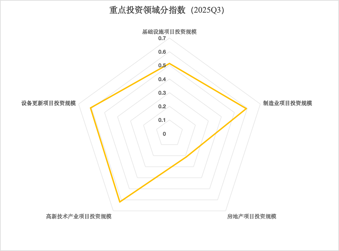 2025年三季度重点投资领域分指数为54.9%,较二季度上升0.6个百分点,延续回升态势。其中,高新技术产业投资项目评价指标指数为61.9%,制造业项目评价指标指数为59.2%,设备更新投资项目评价指标指数为60.8%,制造业投资项目评价指标指数为59.2%,基础设施投资项目评价指标指数为51.4%。三季度以来,国家持续推进制造强国战略,加大对企业设备更新和技术改造的财税支持力度,制造业投资、绿色能源投资保持较强韧性。同时,新型基础设施建设和传统基建升级改造同步推进,各地交通基础设施、城市老旧小区改造、5G基站、人工智能计算中心等项目建设进度加快。创新驱动发展战略深入实施,高技术服务业投资继续领跑,成为拉动投资增长的重要引擎。但由于房地产投资规模持续收缩,增速明显回落,制约三季度投资信心指数的向好态势。