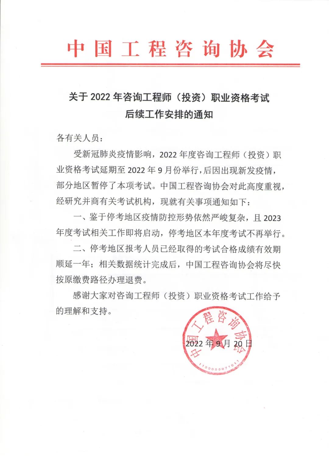 【概要描述】关于2022年咨询工程师(投资)职业资格考试后续工作安排的通知