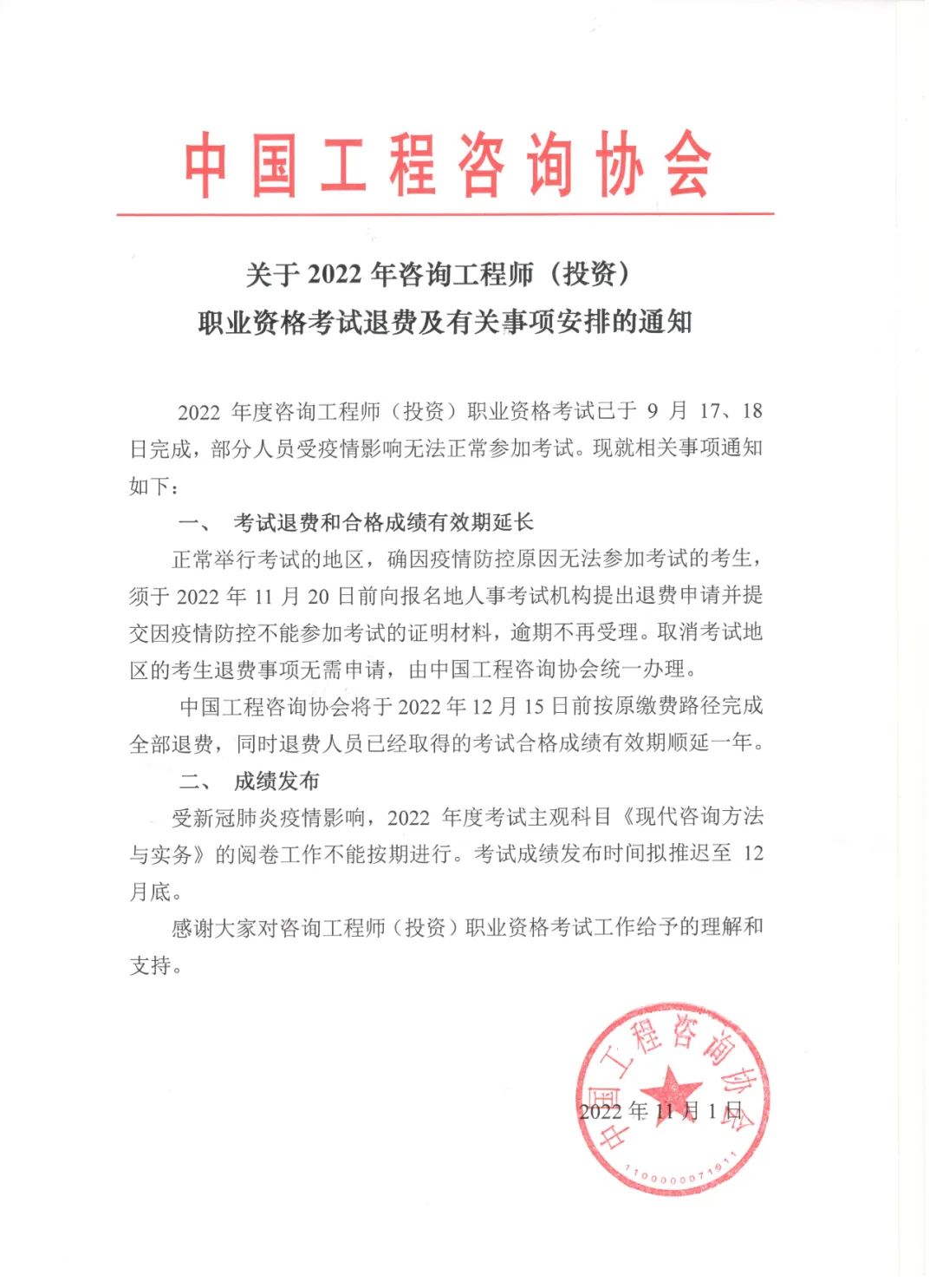 【概要描述】关于2022年咨询工程师(投资)职业资格考试退费及有关事项安排的通知
