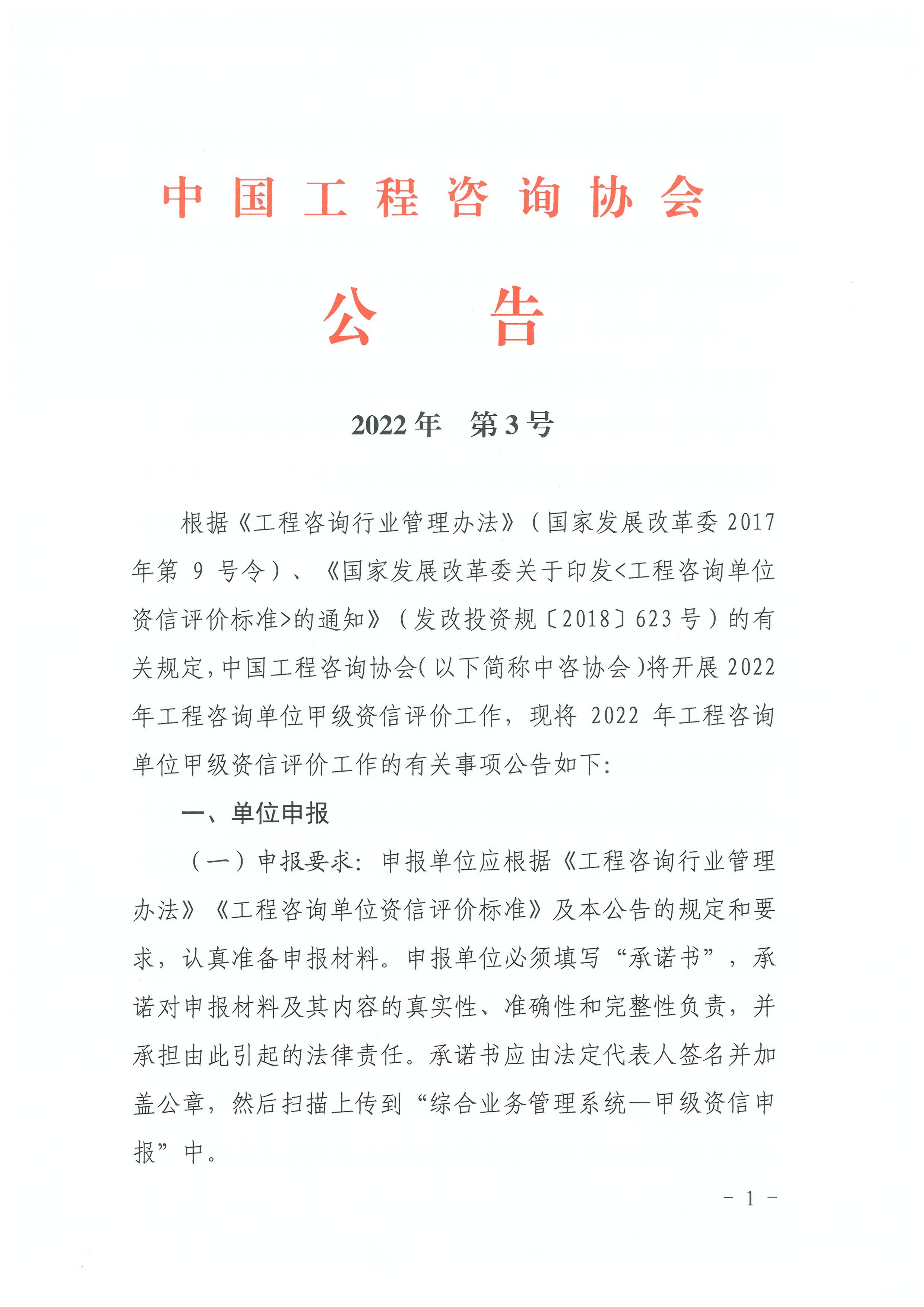 【概要描述】2022年工程咨询单位甲级资信评价有关事项的公告