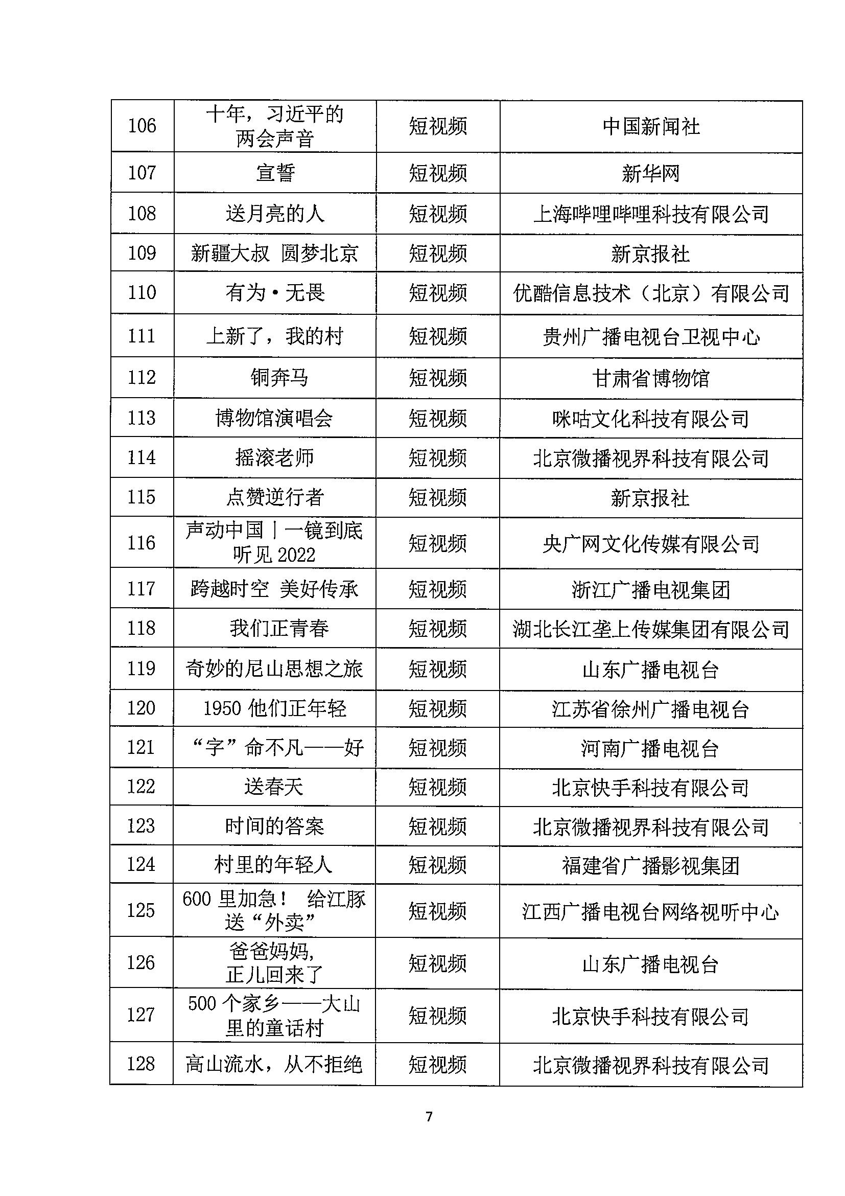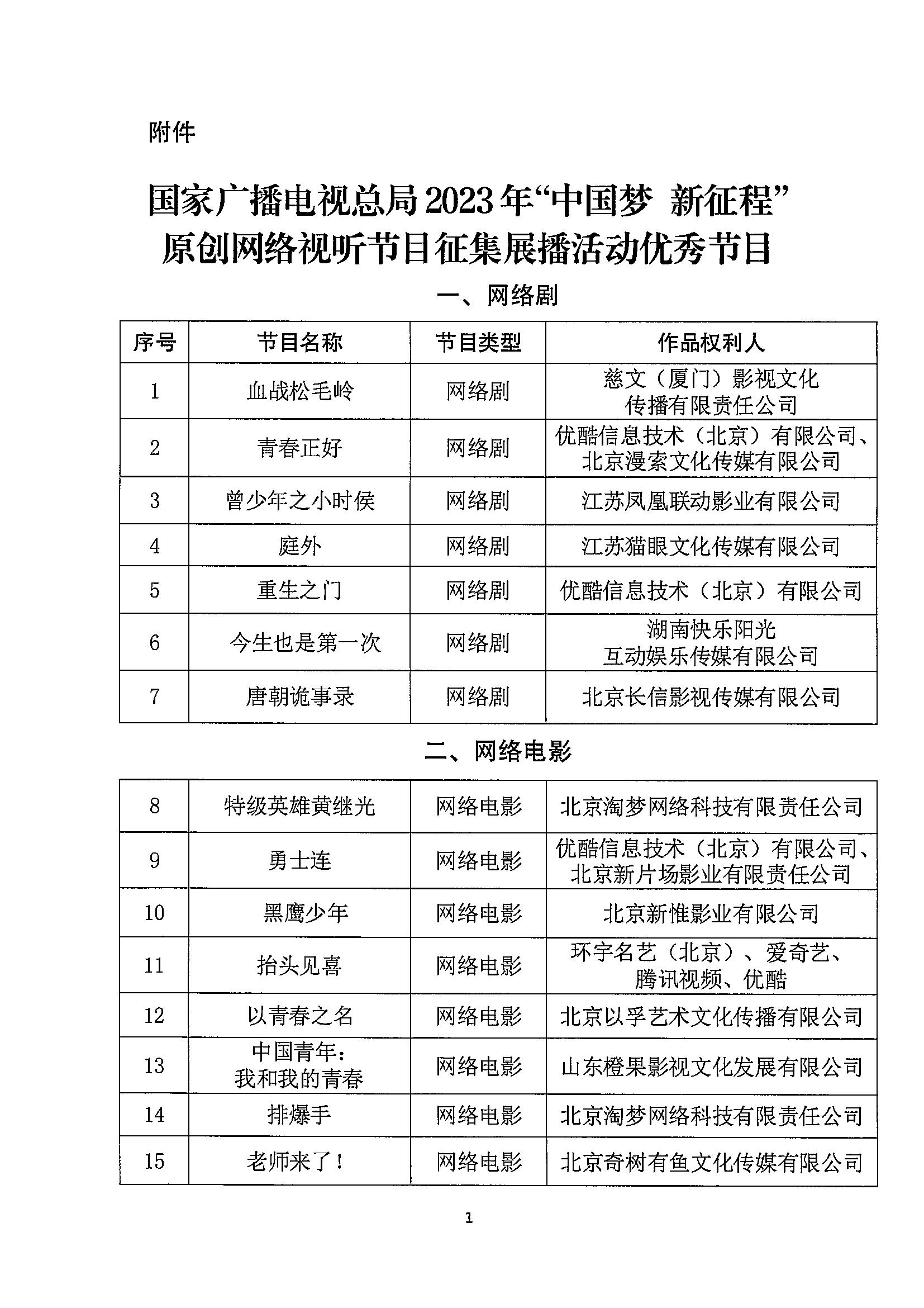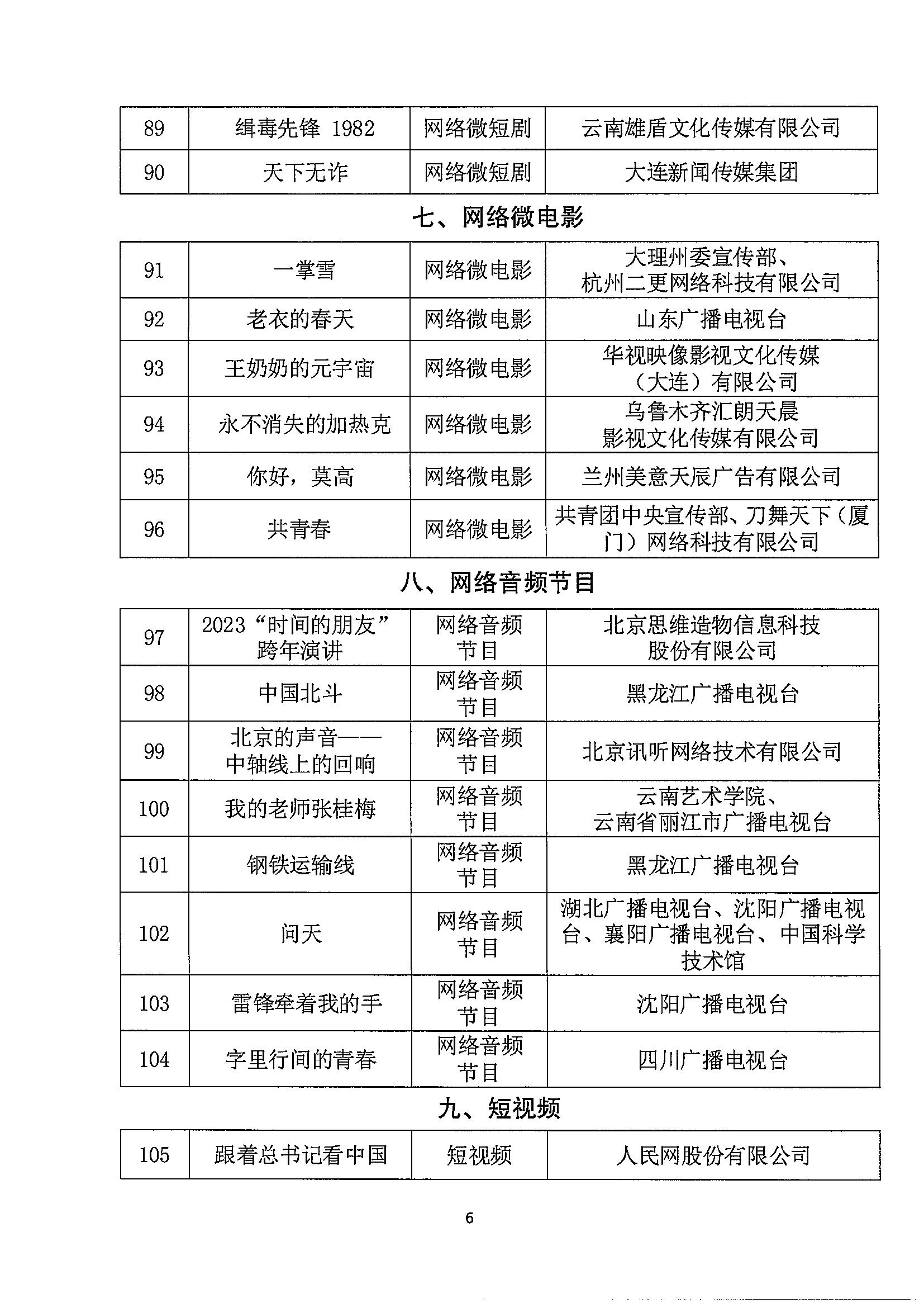 国家广播电视总局办公厅关于公布2023年“弘扬社会主义核心价值观 共筑中国梦”主题原创网络视听节目推选结果暨组织2023年“中国梦 新征程”原创优秀网络视听节目展播活动的通知:http://www.nrta.gov.cn/art/2023/8/22/art_113_65243.html