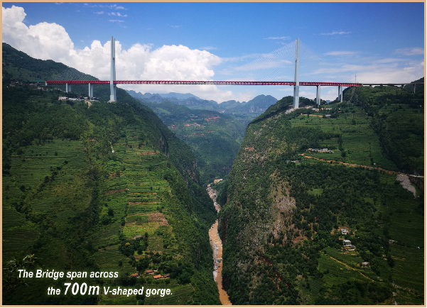 毕都北盘江大桥是中国的浙江杭州至云南瑞丽高速公路的最后一公里工程。一方面,该项目的建设打通了滇黔边界的交通瓶颈,实现了西南地区尤其是贵州西部交通干线的大贯通。同时,本项目的建成为当地群众的出行带来了极大的便利,使宣威至六盘水的出行时间从 5 个小时缩短为 1 个小时。便利的交通促进了黔滇地区区域经济的加 速发展,同时,建成后的北盘江大桥与周围的巍峨山峦和秀丽风光融为一体,吸引了大量游客观光旅游,为当地旅游市场的发展增添了新活力。 本项目位于贵州、云南两省交界处的巍巍乌蒙高原,跨越切开山脉而形成的北盘江大峡谷,高差达 700 米、深 V 型,把云贵两省深深的隔绝开来;两岸悬崖峭壁,地势险峻,地质条件十分复杂且气候恶劣;云南宣威城区到贵州六盘水原有交通出行只 能通过蜿蜒的盘山路,行车风险高且事故频发,一般的车程需要 5 个小时左右,遇到恶劣天气则导致整个交通瘫痪,交通的不便直接导致物流不畅,很多农产品难以外 销,当地居民的生活水平难以改善。