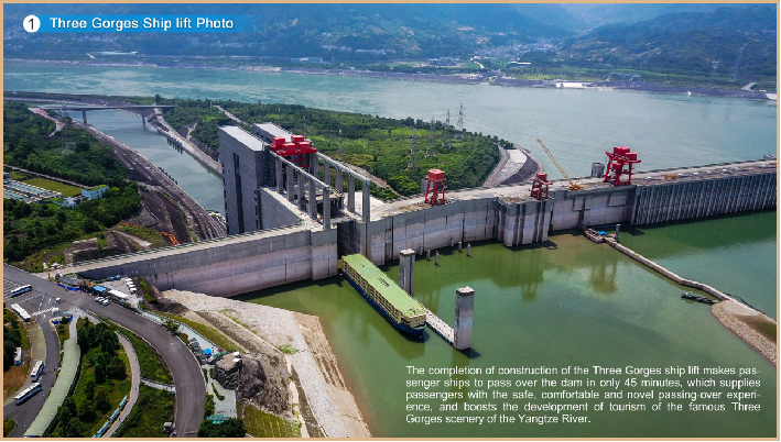 三峡升船机是三峡水利枢纽的重要通航设施之一,布置在枢纽左岸、双线五级船闸的右侧,为全平衡齿轮齿条垂直爬升型式。三峡升船机设计船型排水量3000t,最大提升高度113m,承船厢有效水域120m×18.0m×3.5m(长×宽×水深),船厢带水总重量15500t,是世界上规模最大的升船机。三峡升船机的建成为客船和其它特种船舶提供了快速过坝通道,使船舶翻越三峡大坝的时间由通过五级船闸的3.5小时缩短为45分钟,年双向通过能力约2000万吨,加大了三峡水利枢纽通航能力。