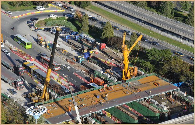 北京三元桥位于高速路和城市快速路交汇处,日均车流量20.6万辆,有48条公交线路从桥上通过,日均搭乘乘客72.7万人次。桥梁长55米,宽48米,如采取传统工艺更换劣化的主梁,主路需断行90天,造成极大的社会和经济损失。项目采用千吨级驮运架一体机、激光循迹、卫星导航等技术,用时43小时完成桥梁整体置换,为特大城市重要交通节点桥梁改造提供了新方案,解决了城市桥梁更新对社会、交通影响的关键技术难题,对同类工程具有指导意义和示范作用。 项目研制了国际首台千吨级桥梁快速整体置换用驮运架一体机,对旧桥拆除、新梁运输、高精度安装就位、施工监控等关键技术进行了系统研究,研发了基于激光循迹和卫星导航的精确就位控制系统,在43小时内采用双台驮运架一体机对三跨连续梁进行了整体置换。与传统工艺相比,项目减少了97.8%占路时间。施工期间利用立交匝道以环岛方式保证了公共交通的畅通,最大限度地降低了对交通和环境的影响,充分体现了高效节能、绿色环保、以人为本的工程理念。