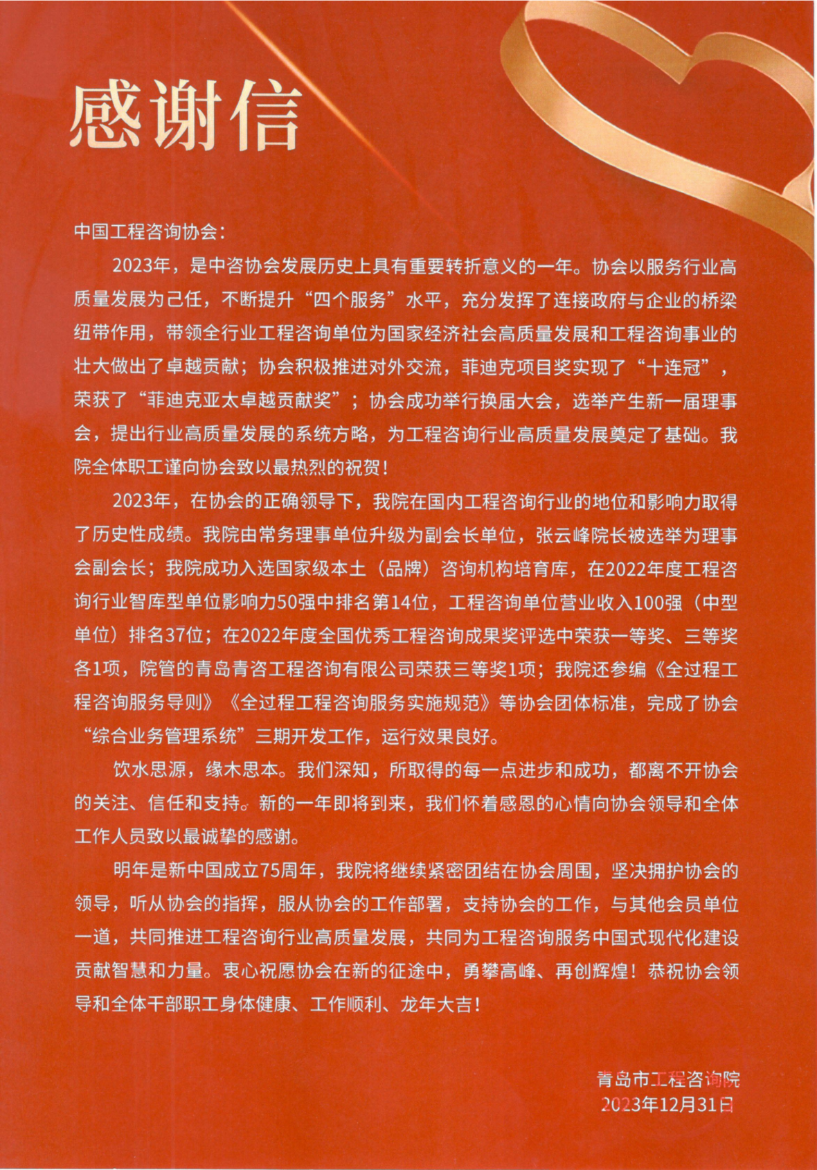 青岛市工程咨询院感谢信