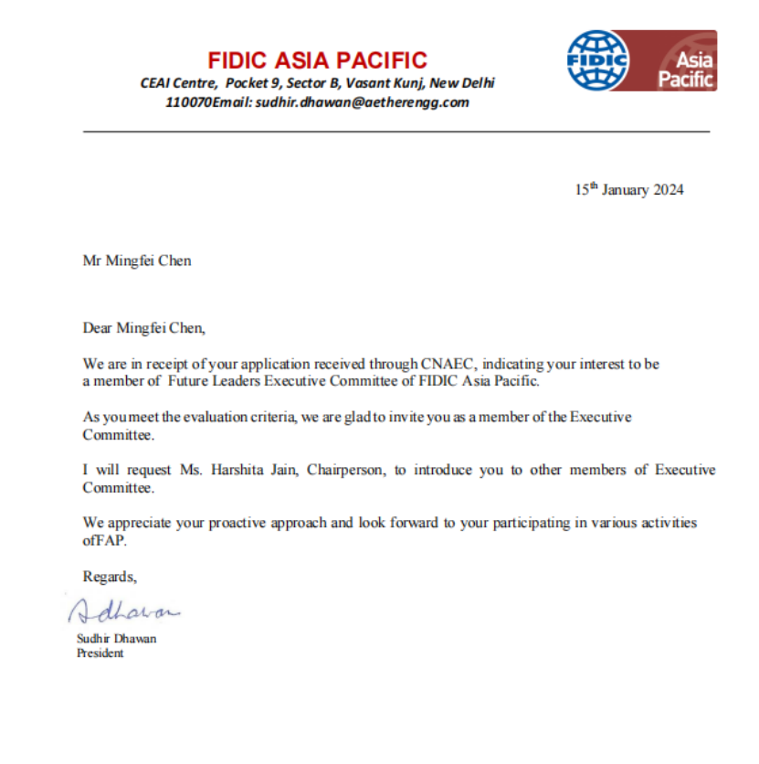陈鸣飞先生作为中国工程咨询行业的青年代表当选委员,将为菲迪克亚太区未来领导者执委会带来新的活力和创新思维,共同推进亚太地区工程咨询行业的发展,必将增强中国工程咨询行业在国际工程咨询领域的声音和力量。