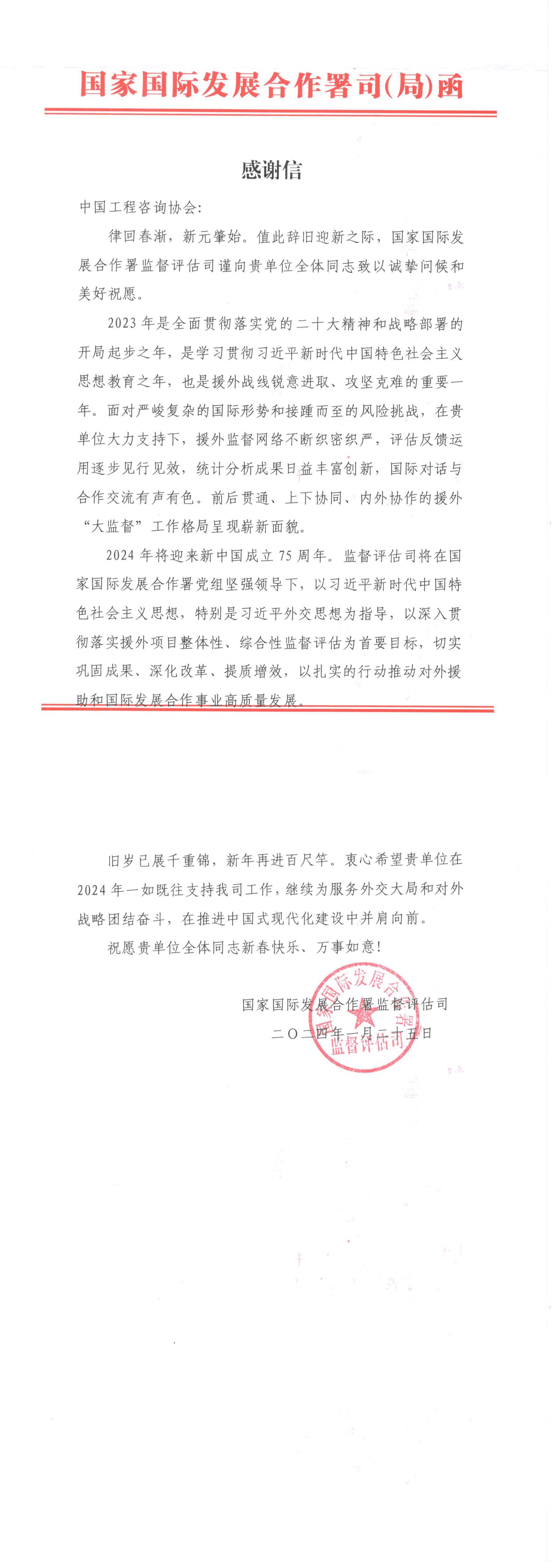 国家国际发展合作署监督评估司感谢信